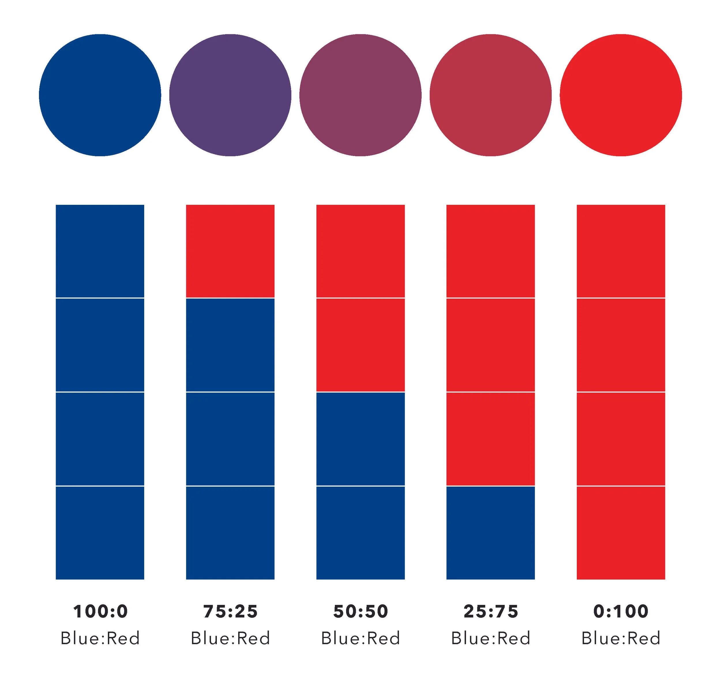 You can see the ratios I used above. This is a good starting point. You could experiment with even more steps between the two colors if you are interested. Another approach could be: 90:10, 80:20, 70:30 etc.